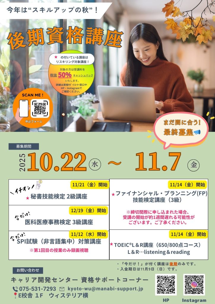 🍁11/7(金)まで🍁後期資格講座 最終募集について