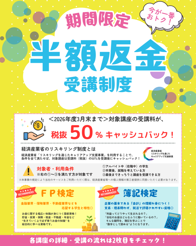 リスキリングとは、経済産業省「リスキリングを通じたキャリアアップ支援事業」のことで、条件をクリアしていれば対象講座の受講料(税抜)の50%相当額の返金を受けることが可能です。
